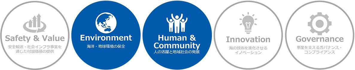 商船三井グループでは、事業を通じて優先的に取り組むべき社会課題として特定した「サステナビリティ課題」への対応を推進することで、持続可能な社会の実現に貢献します。本件は、5つのサステナビリティ課題の中でも特に「Environment -海洋・地球環境の保全-」、「Human & Community -人の活躍と地域社会の発展-」にあたる取り組みです。