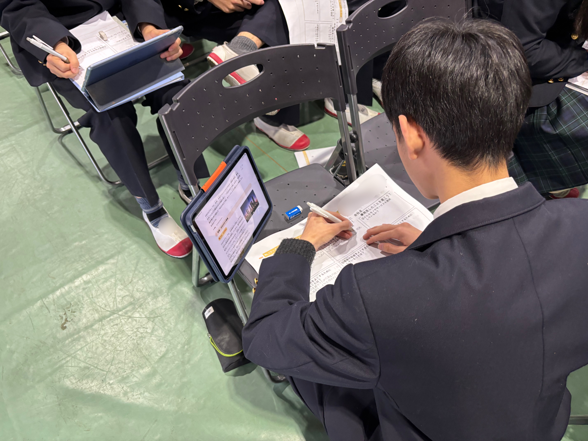 生徒の皆さんが生活する神奈川や横浜市の街にも目を向け、どんな会社やお店があるかについてもグループで共有しました。調べ学習を通して、身近な地域から広く社会へ目を向けることで、視野の広がりと新たな気づきを得る機会となりました。2コマの授業時間の後半では、グループワークを通して生徒の皆さんそれぞれに得られた気づきと積極的な発言によって、新たな発見や着眼点を共有することができました。