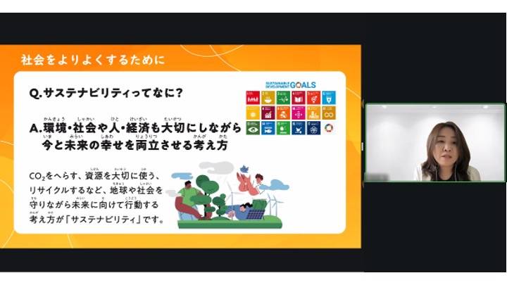また、「業界」や「業種」など普段、馴染みのない言葉を聞き、興味や探究心を持つ児童も多かったようです。いつも生活している家や学校の近くの街並みを思い浮かべながら、社会にはどんな業種や会社があるのかをみんなで考えました。身近な飲食店や自動車メーカー、いつも買い物をするスーパーなど、社会には、多くの会社があることに改めて気づきました。さらに、SDGsやサステナビリティについても「会社」が取り組む活動を事例としながら、考えを深めました。