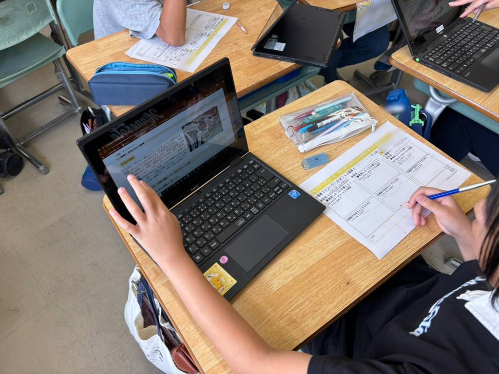後半では、「会社探究シリーズ」を活用して、ワークを行いました。「会社探究シリーズ」は、様々な業種・業界の会社の取り組みが掲載されています。各グループに分かれて、業種について調べました。よく知っている会社や業種もあれば、はじめて知った会社や業種もあったようです。みなさん興味も持って、スクロールしページを見ながら学んでいました。その後、各班で調べた業種の中から、1業種をピックアップし、わかったことをオンライン上で、発表しました。各班が調べた業種についてプレゼンテーションを聞くことで、2クラス全体での学びが相乗し社会には、どんな業種があるのか、どんな会社があるのかについて、一層に気づきが深まったようです。