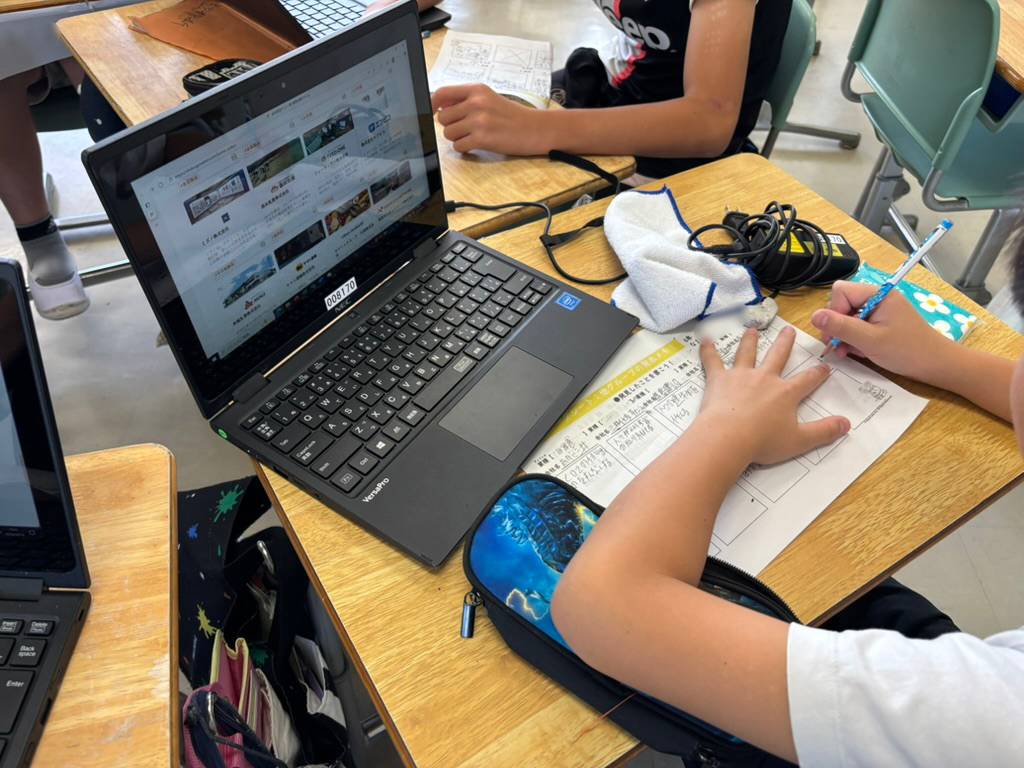 小学6年生2クラス52名が兵庫から、講師は東京から参加しオンラインで楽しく学ぶことができました。児童のみなさんは、教室の大きなスクリーンに映し出されたスライドで、社会の仕組みや、会社が取り組んでいる活動から、私たちの暮らしとのつながりについてなど、クイズや解説を通して理解を深めることができました。解説を聞きいた後は、1人1台のタブレットで、「会社探究シリーズ」 を見ながら調べ学習を行い、さらにグループに分かれディスカッションも行いました。