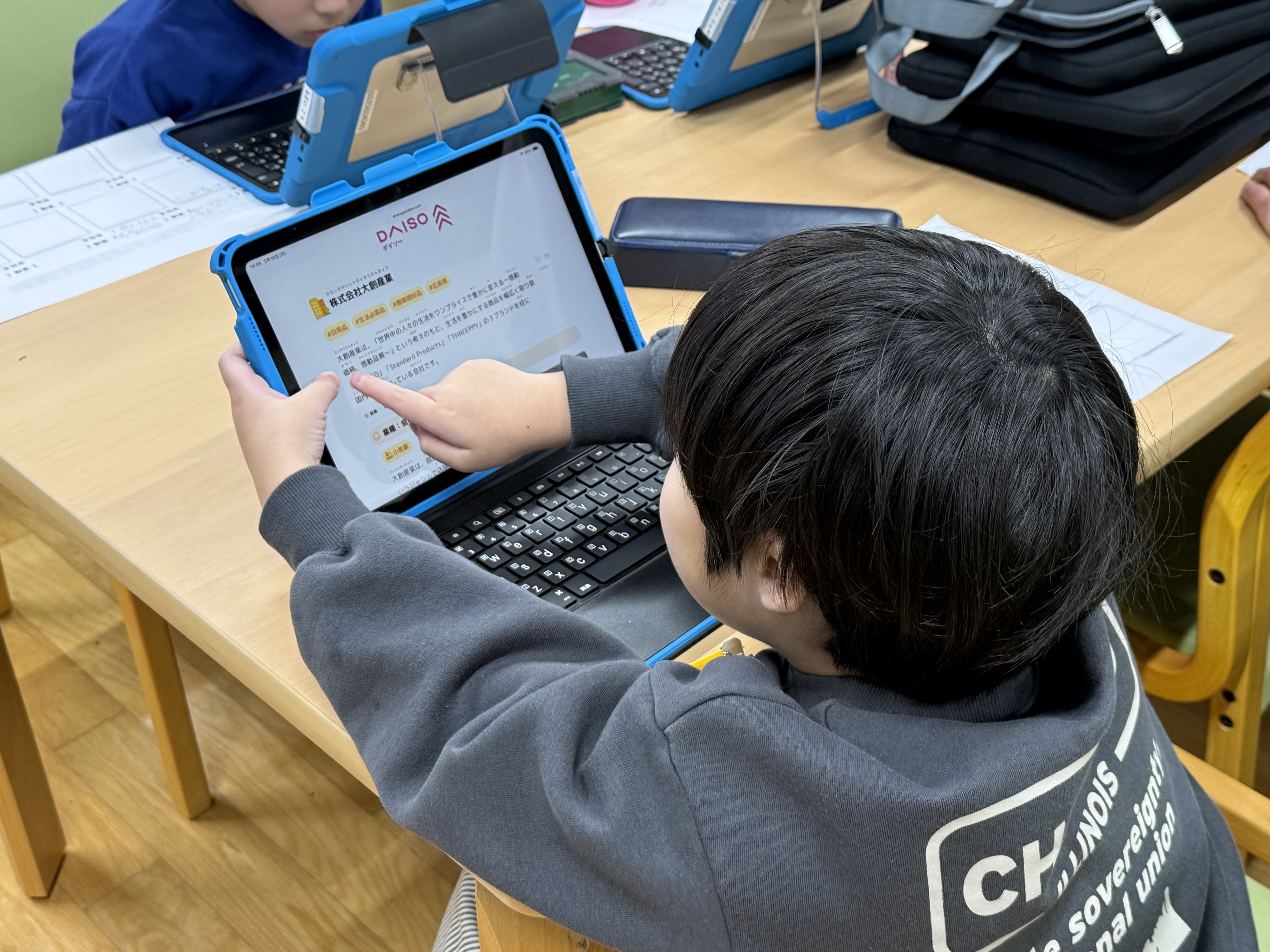 児童の皆さんが生活する大阪や堺市の街にも目を向け、どんな会社やお店があるかについてもグループで共有しました。調べ学習を通して、身近な地域から広く社会へ目を向けることで、視野の広がりと新たな気づきを得る機会となりました。1年生〜6年生の児童の皆さんが参加し、それぞれの学年に応じた学び方を取り入れ進行しました。